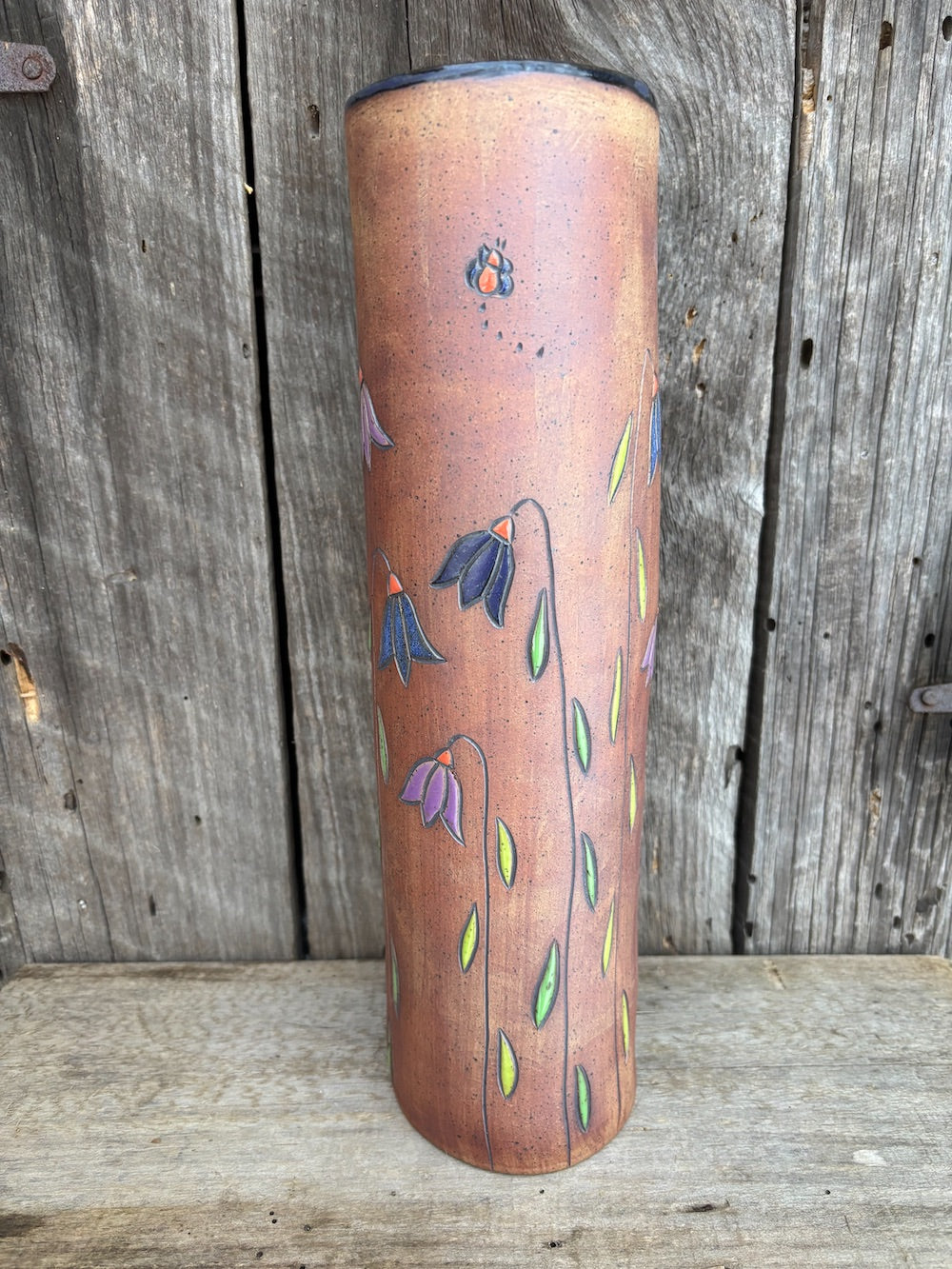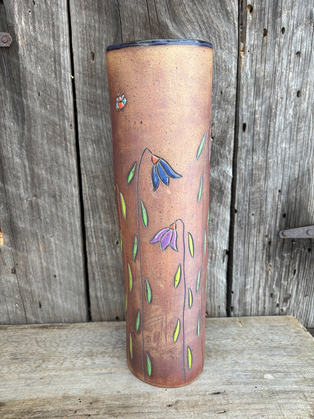 Hand build round tall flower vase.